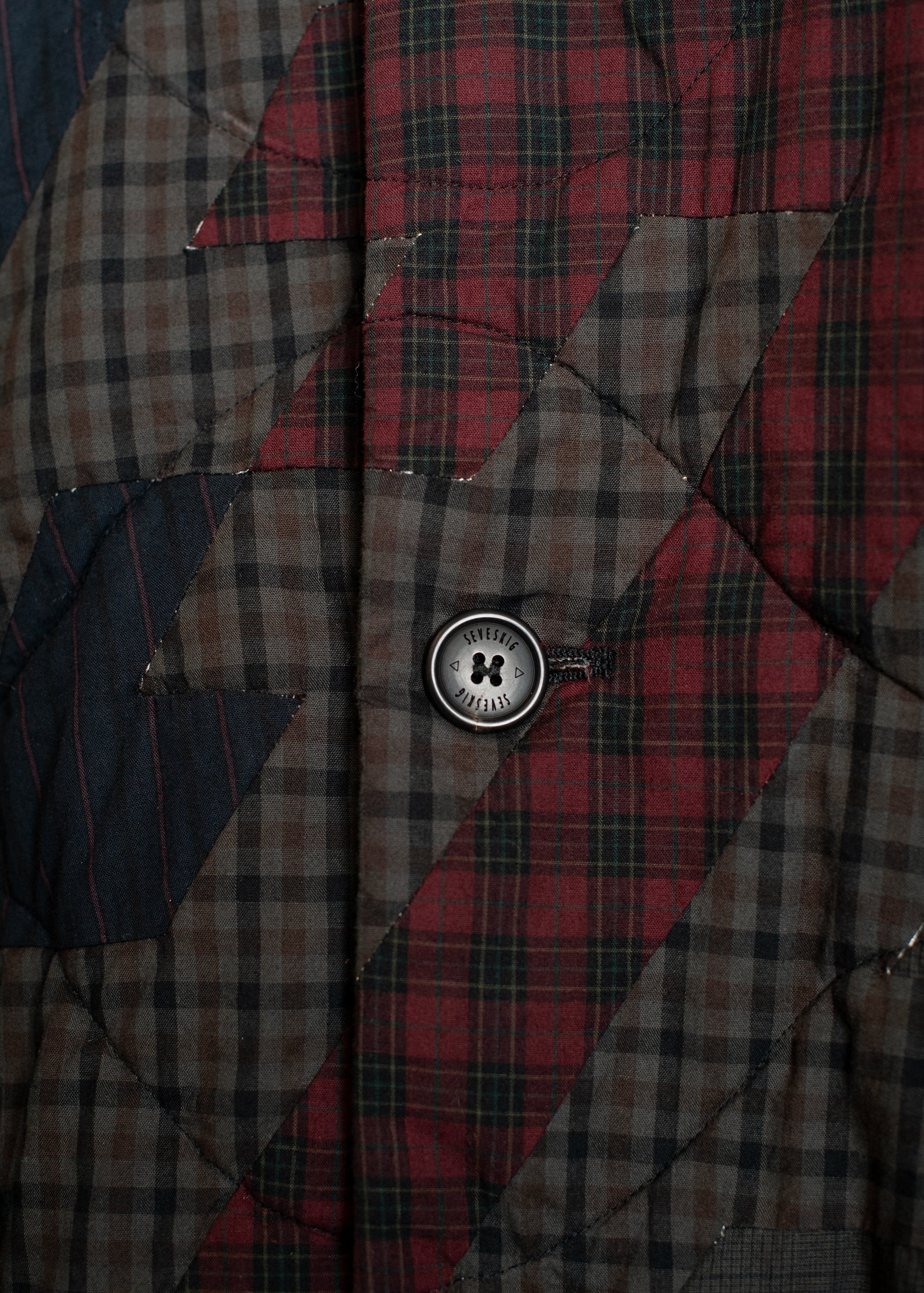 This insulated coat is typical of SEVESKIG, based on a vintage check and featuring panels of different materials reconstructed like a puzzle.