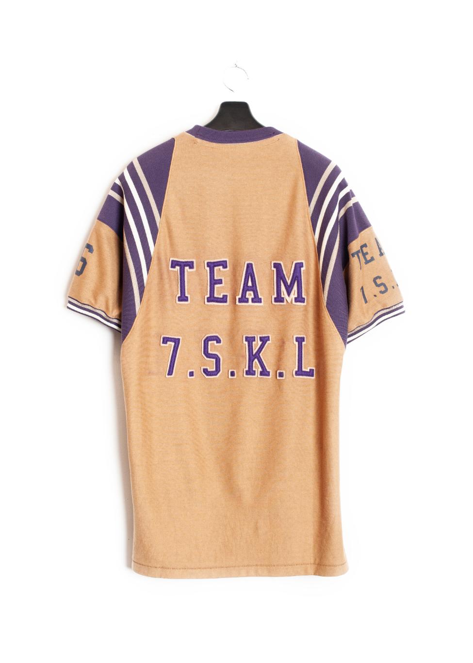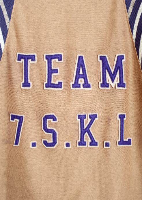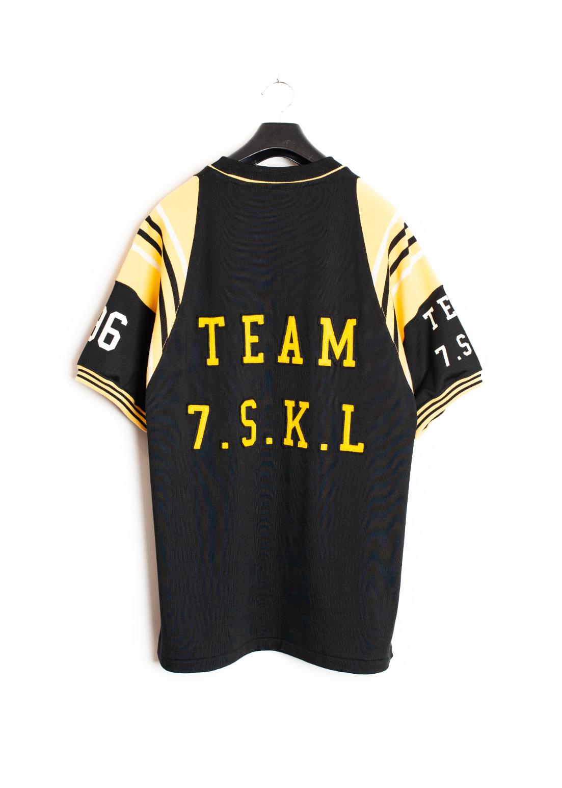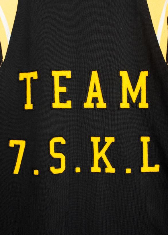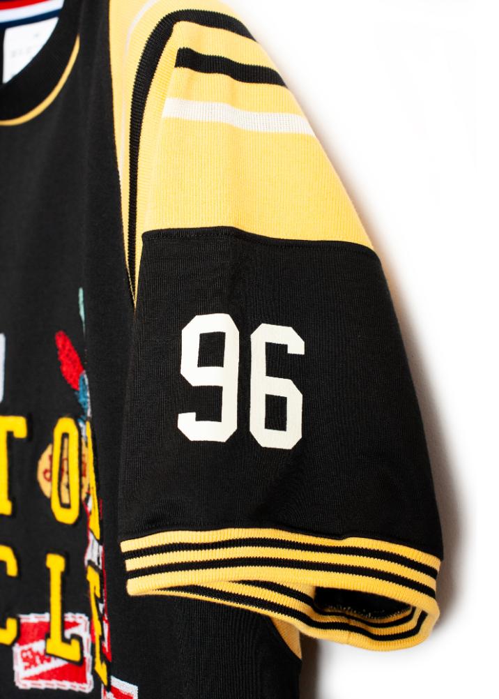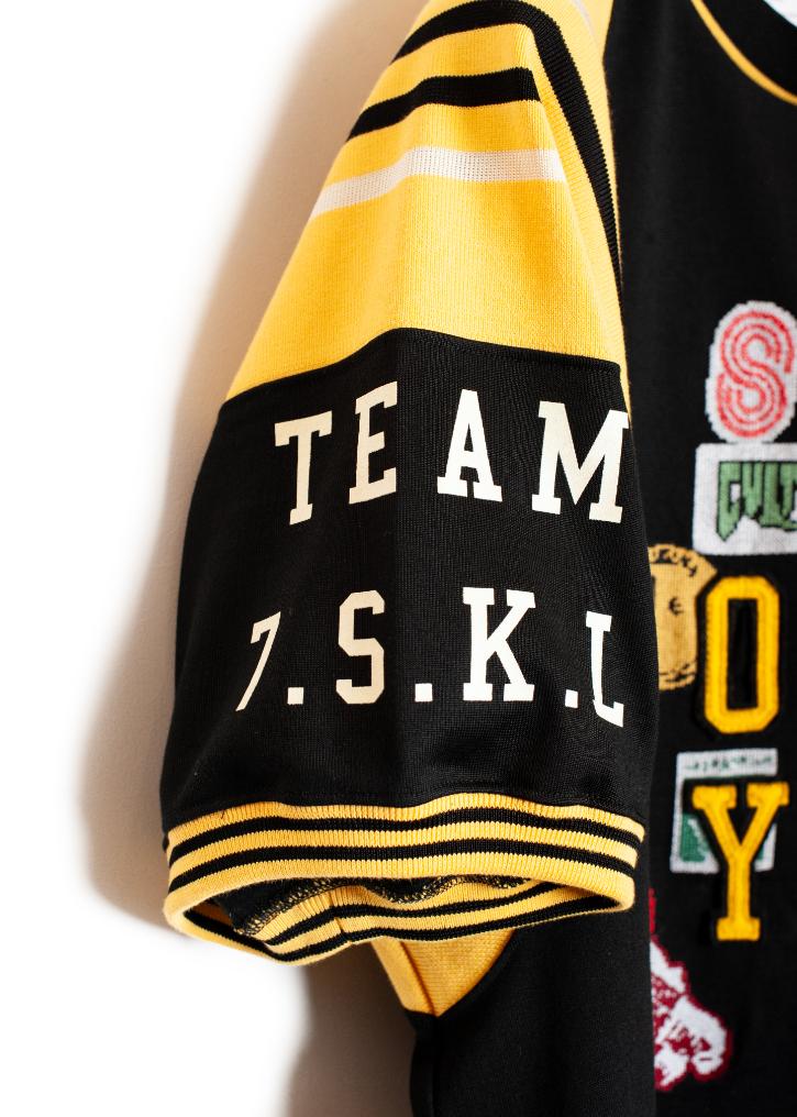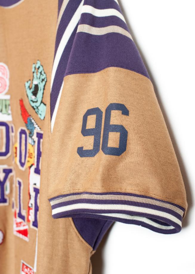 SEVESKIG定番のクロスステッチ表現を落とし込んだデザイン。複数の刺繍モチーフをコラージュしたように配置し、クラフト感とストリート感を両立。