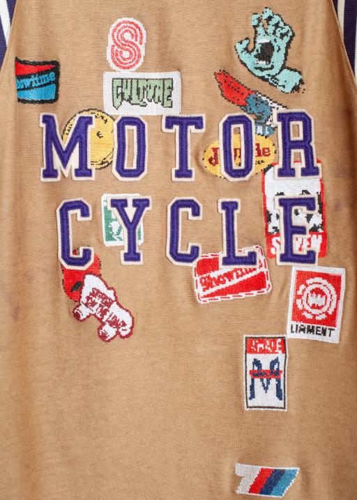 オリジナルで編み立てた綿レーヨン素材を使用した、グラフィックTシャツ。フロントは“Motor Cycle”を軸に、