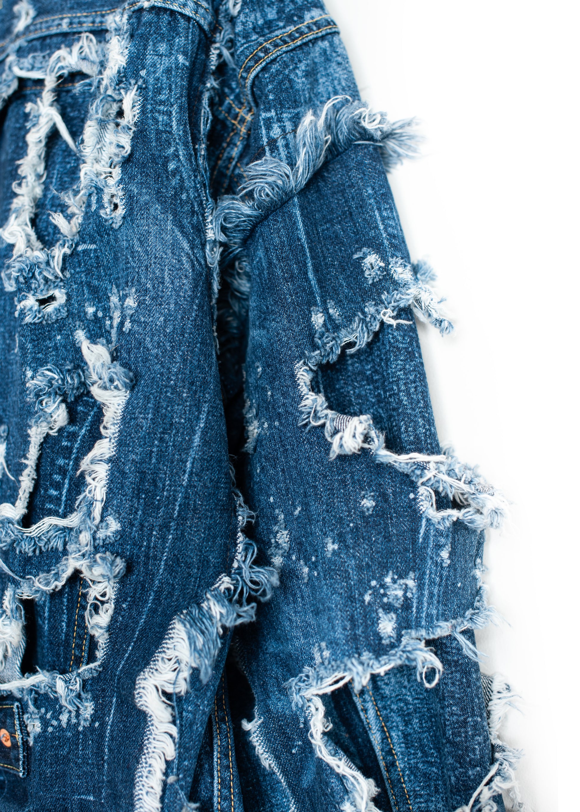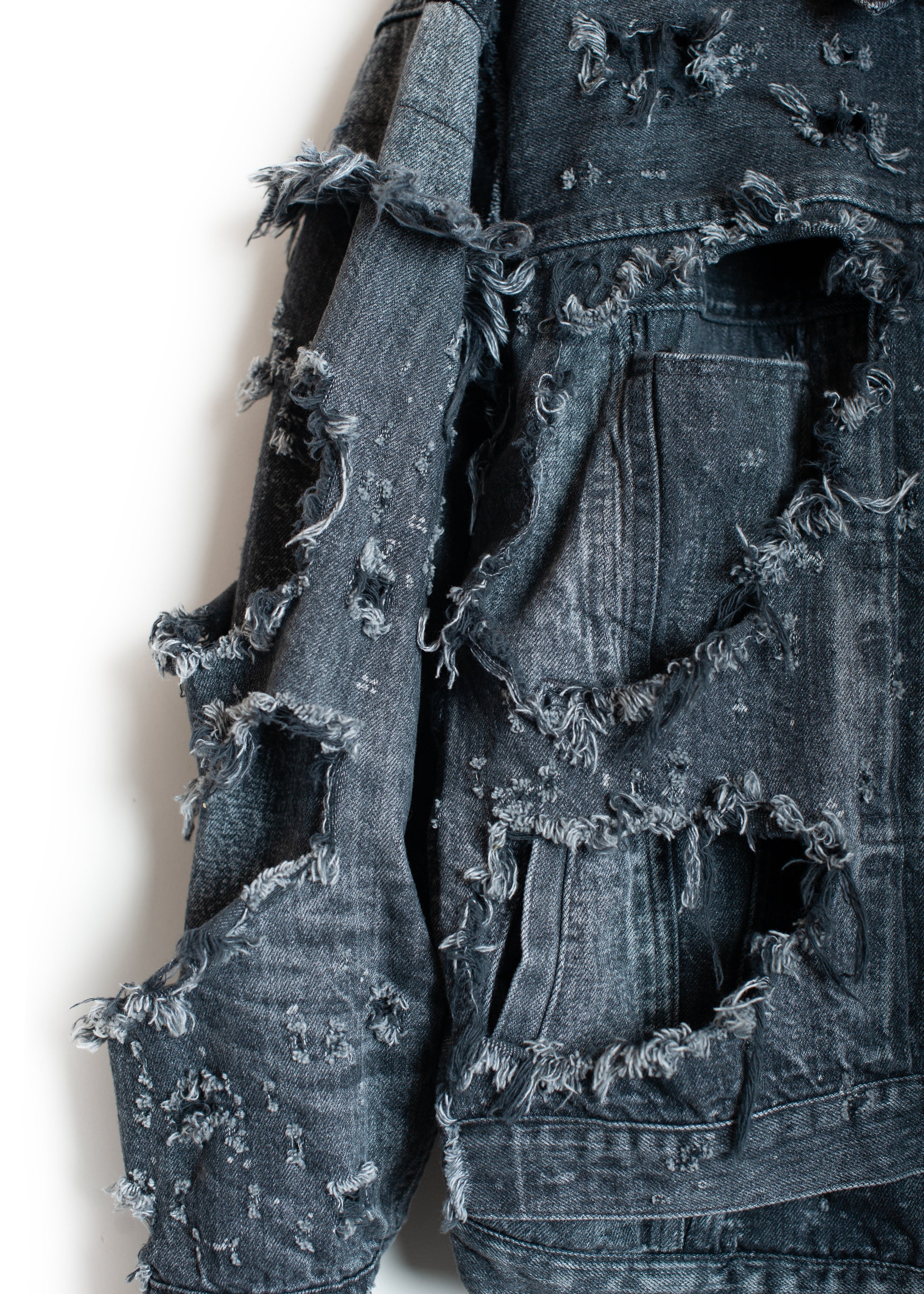 The bold distressed and raw cut details enhance the layered style with innerwear, adding depth to your outfit.