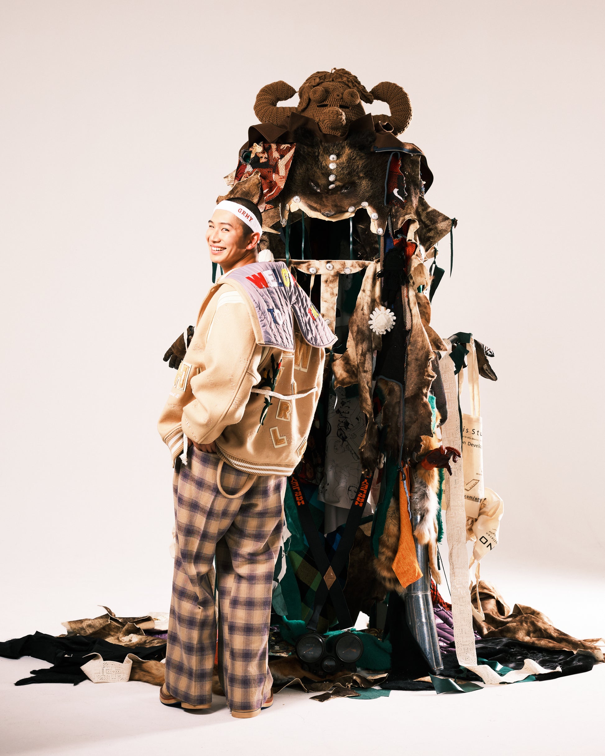 This is an award jacket made using a knit wool compressed melton fabric, which is created by using fur (from bears and deer) produced during the process of making game leather for Seveskig.