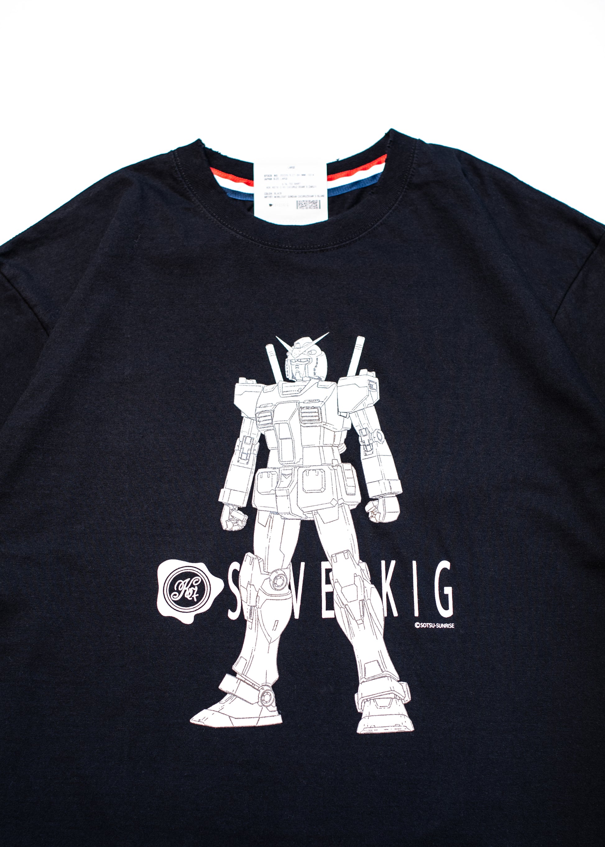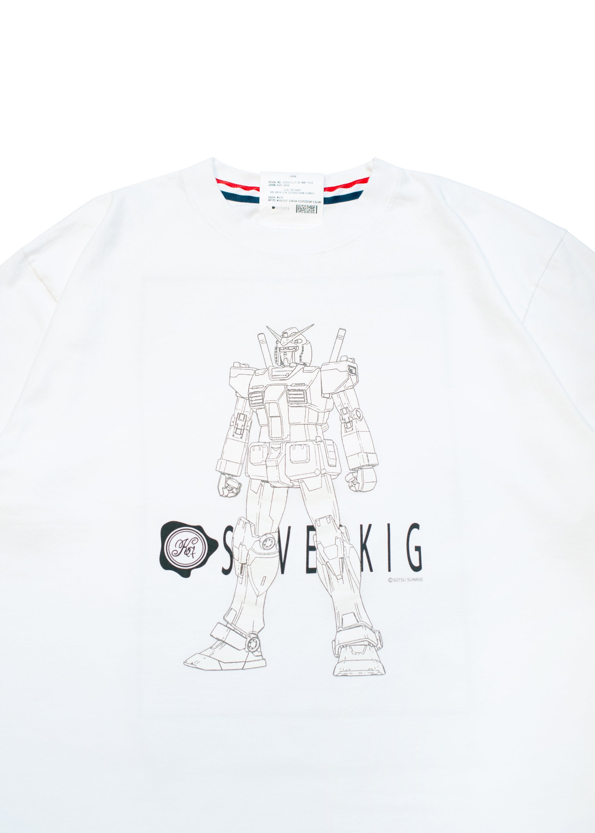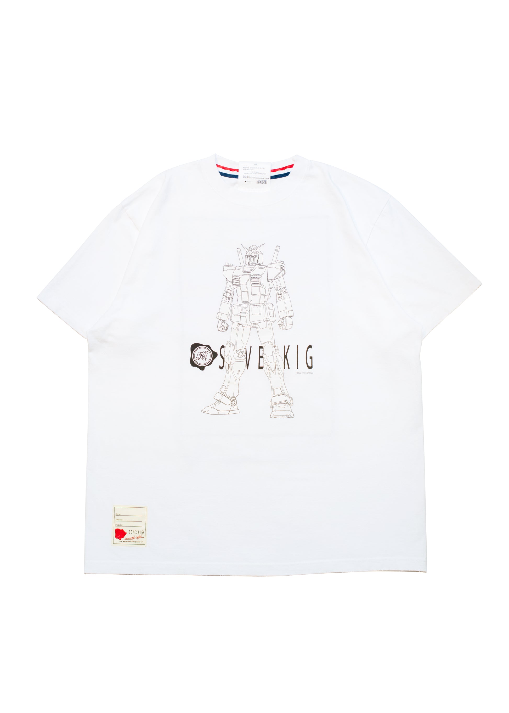The line drawing of the RX78-02 Gundam is printed with a color reflector print that reflects in flashes and headlights.