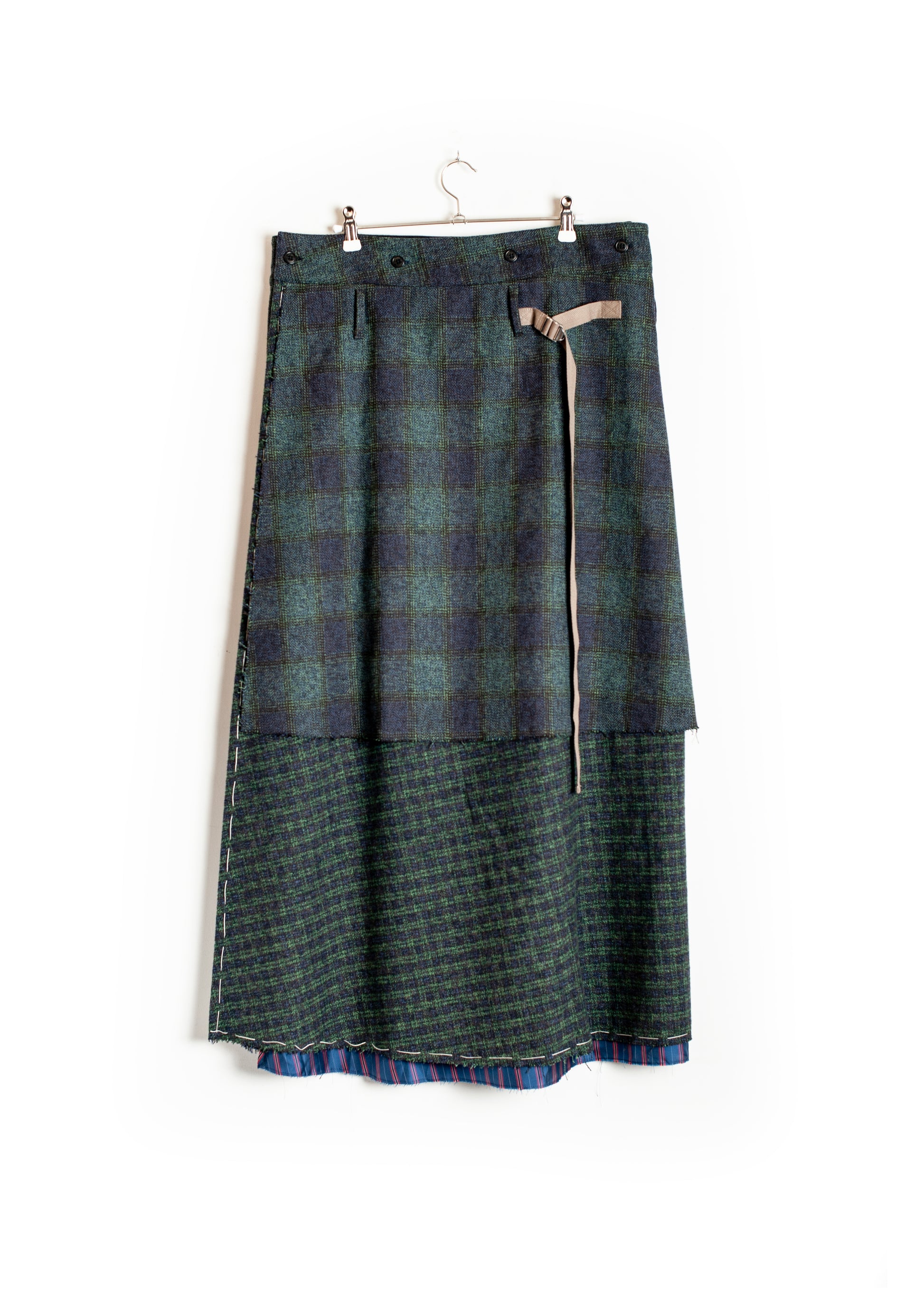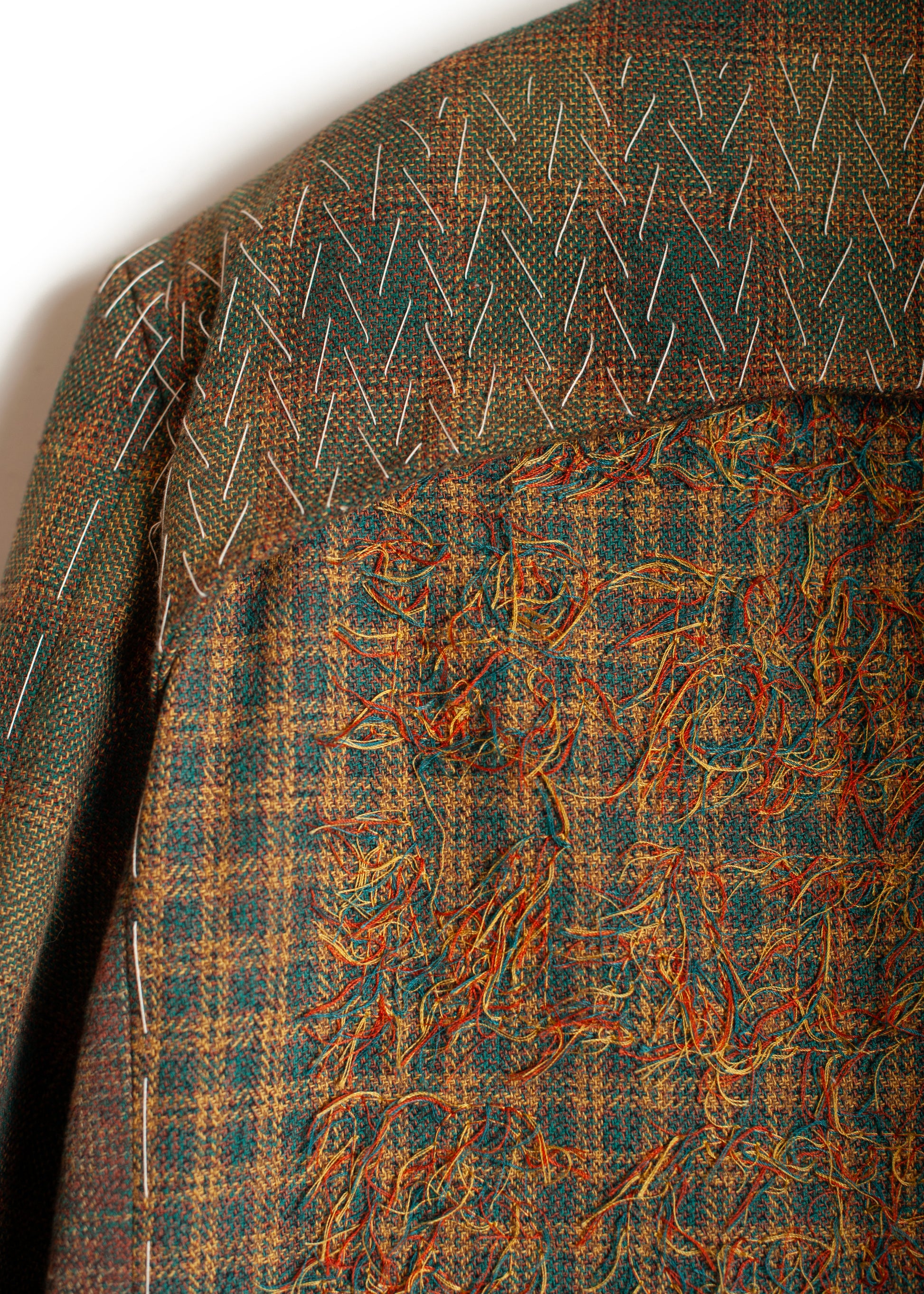 クラシカルなチェックツイードに、1点ずつ手作業で糸刺し(ハ刺し)を施した、SEVESKIGならではの再構築ロングコート。