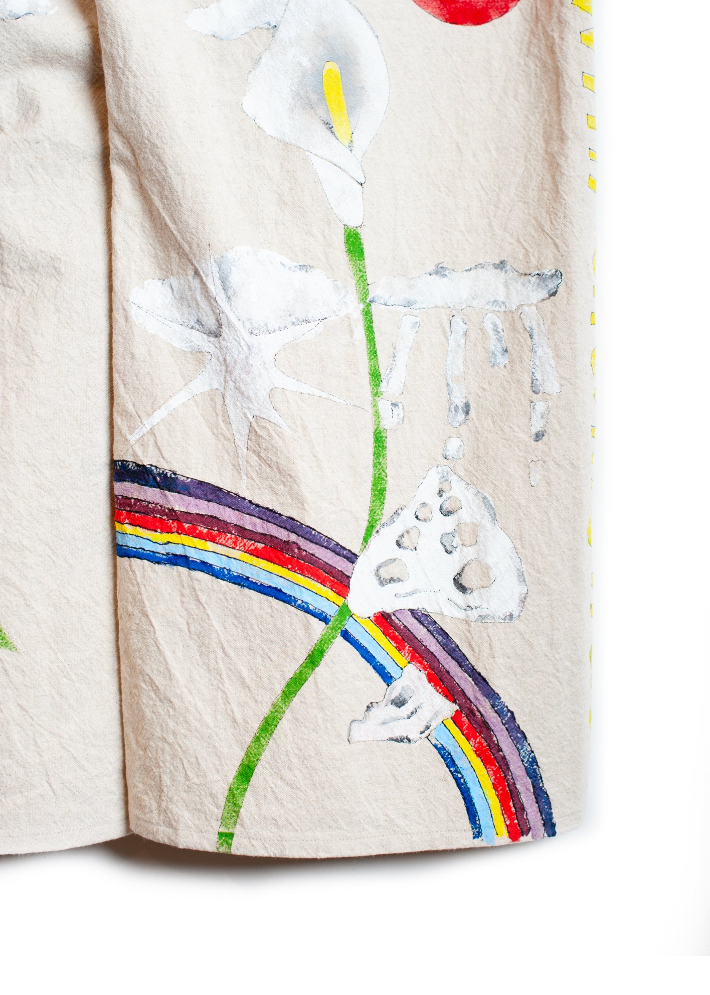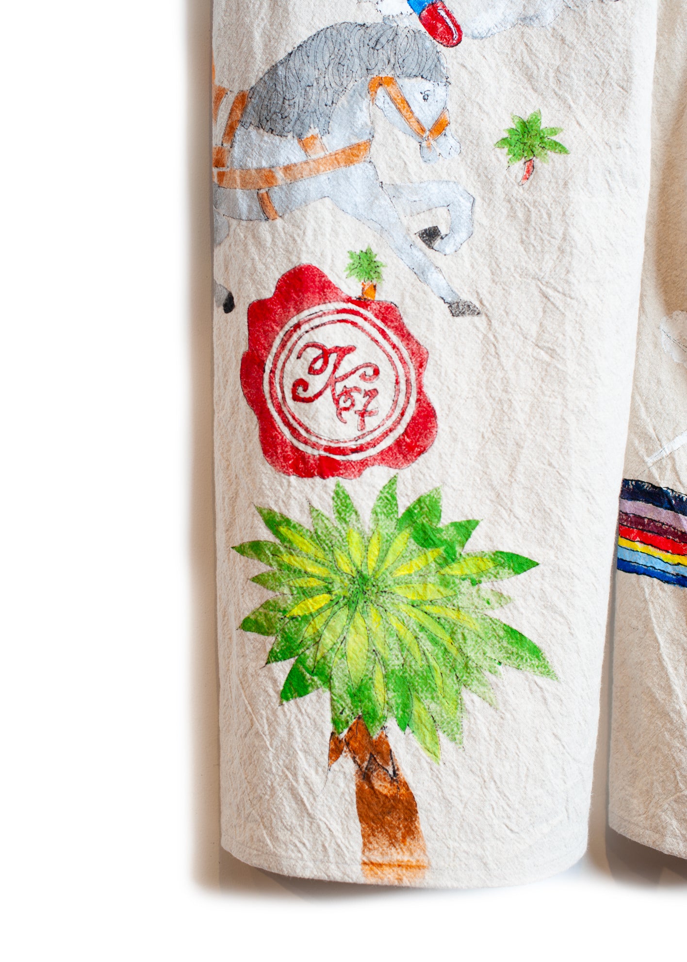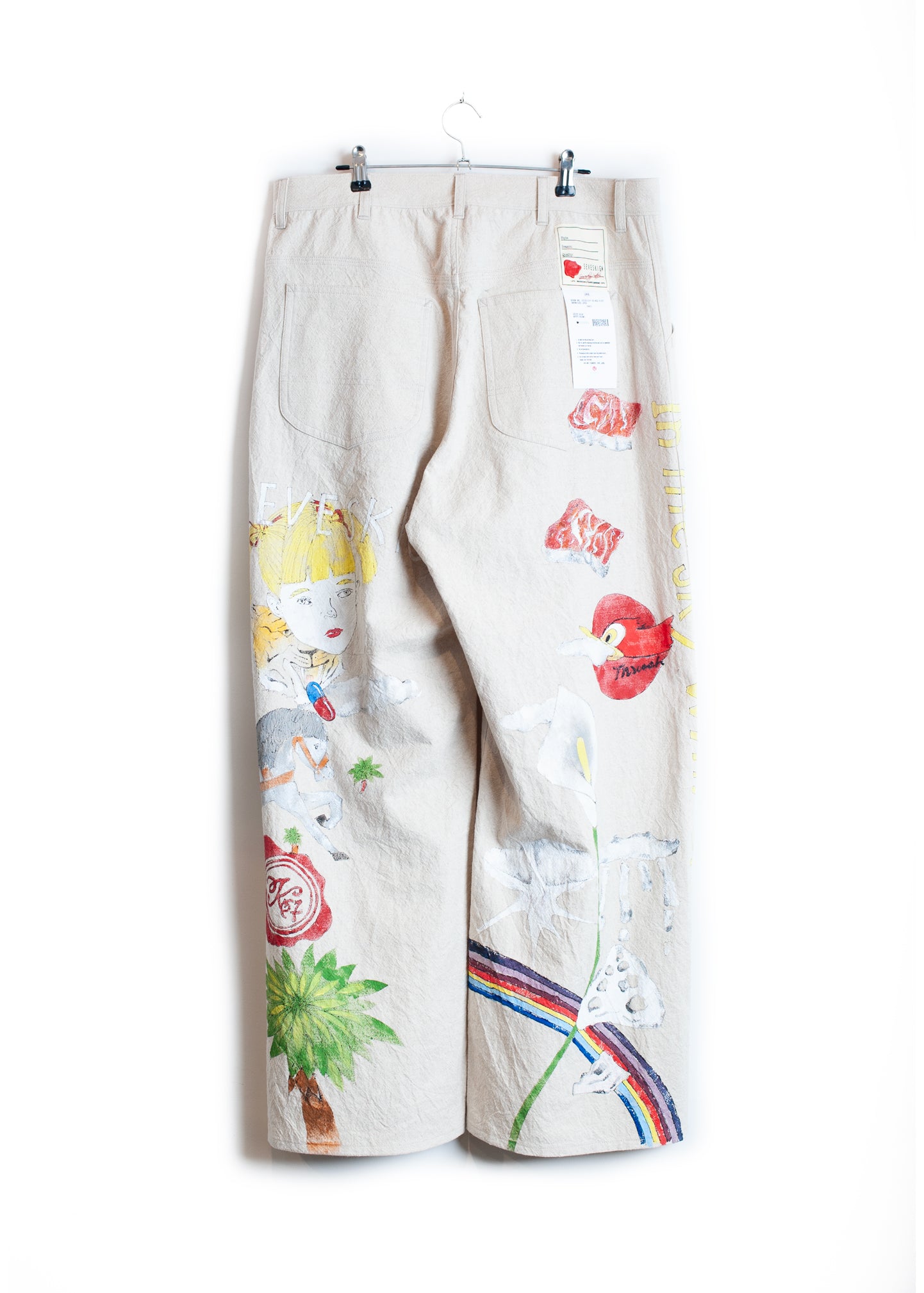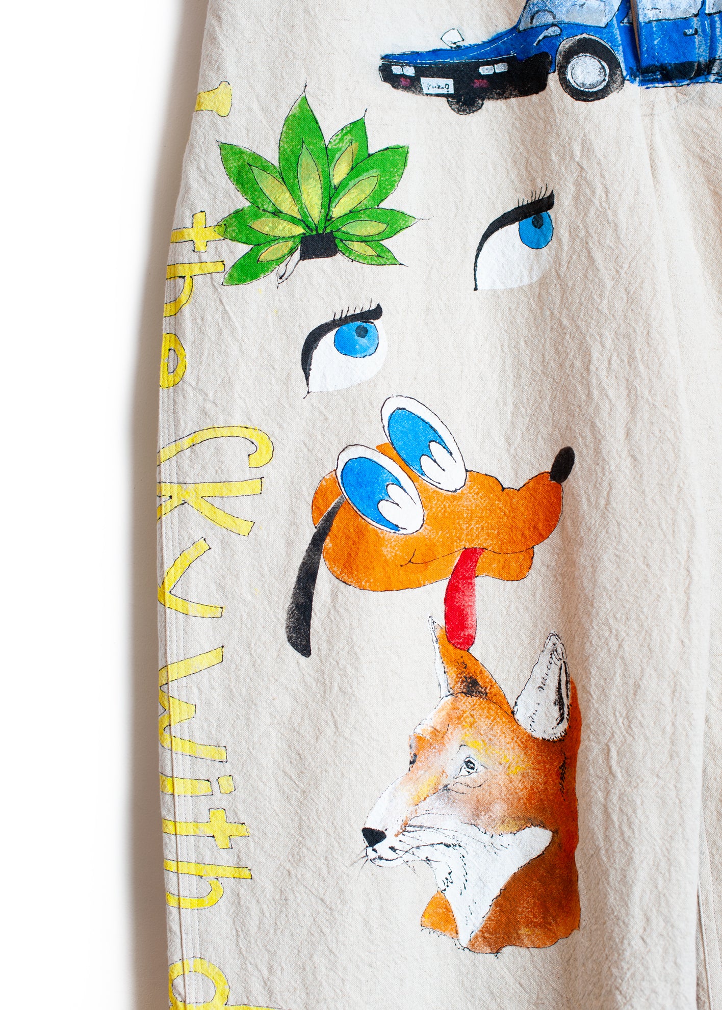 それらのイメージを元にし、イラストを『RIDAWO』氏の自由に描いた絵を手書きしたワイドパンツ。