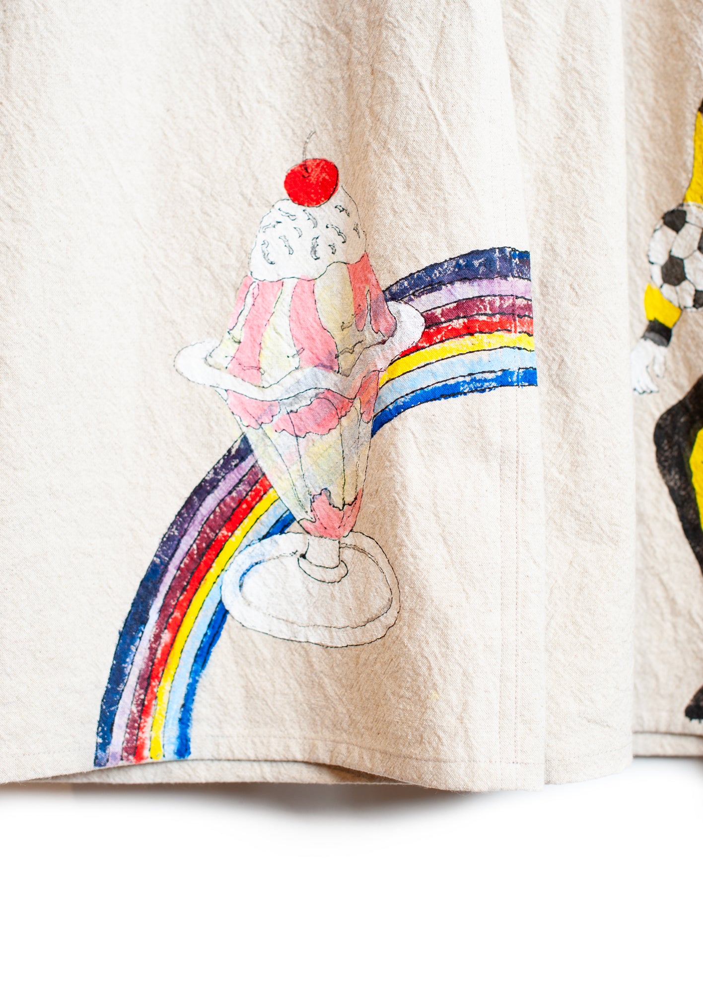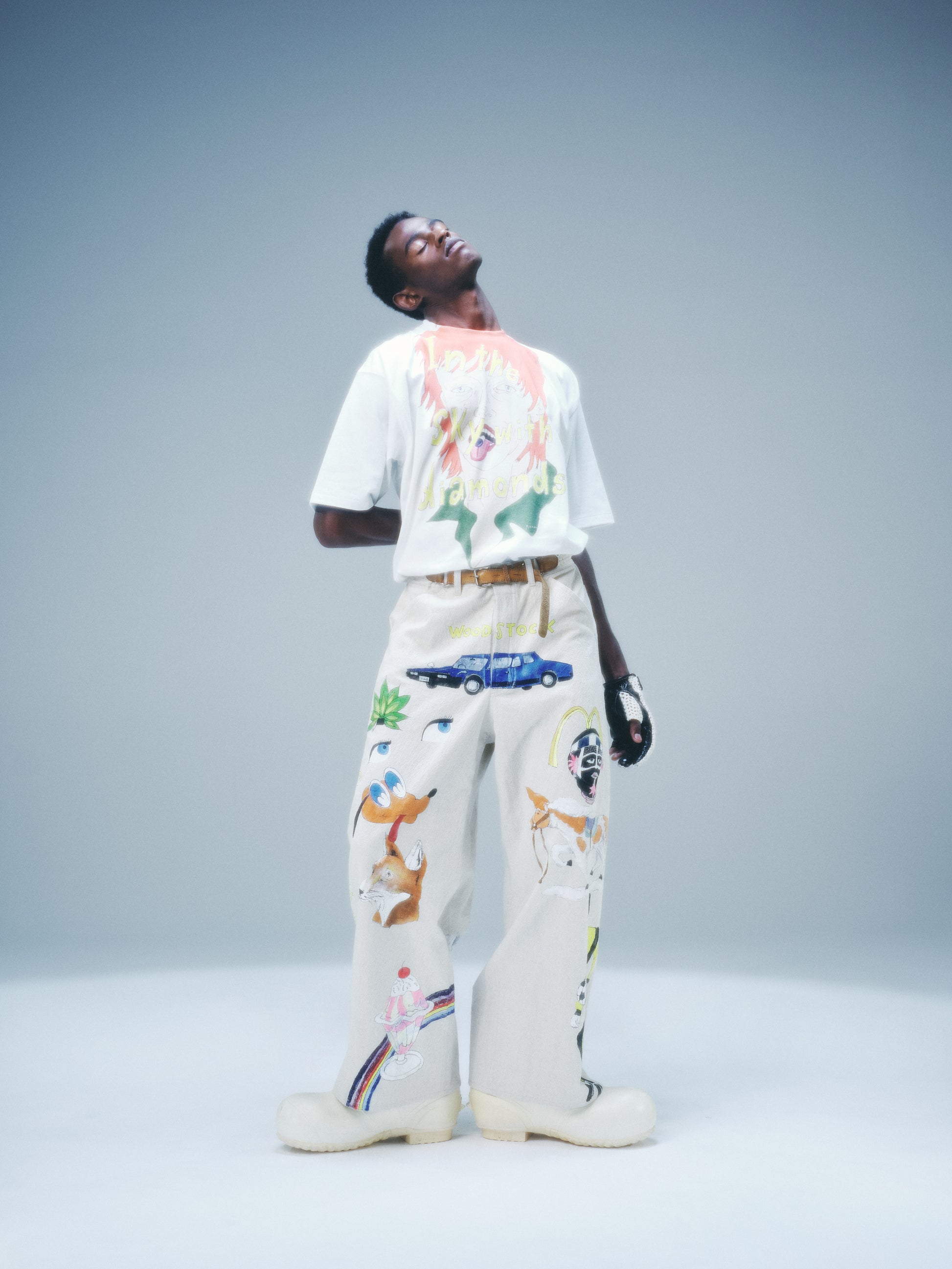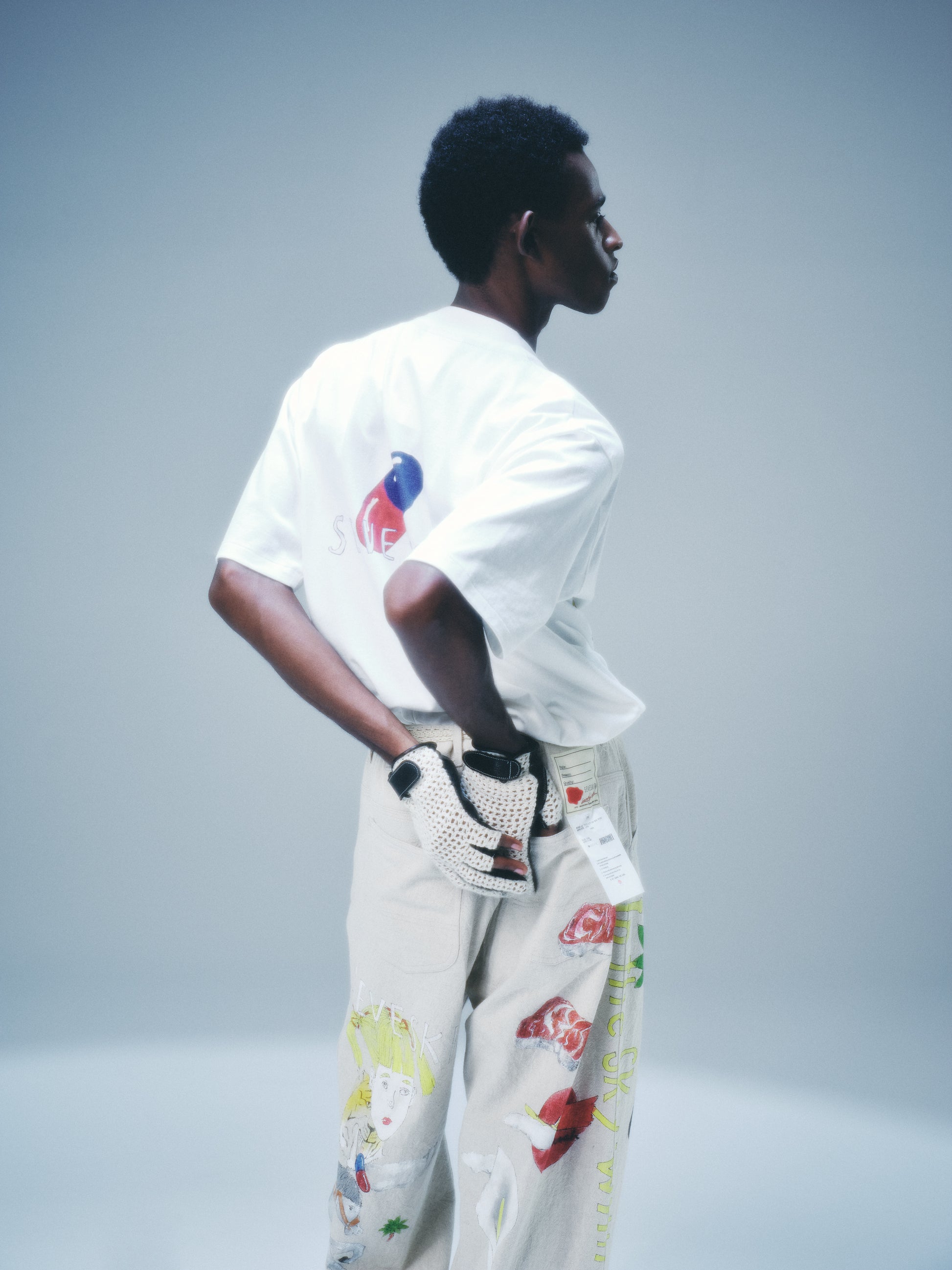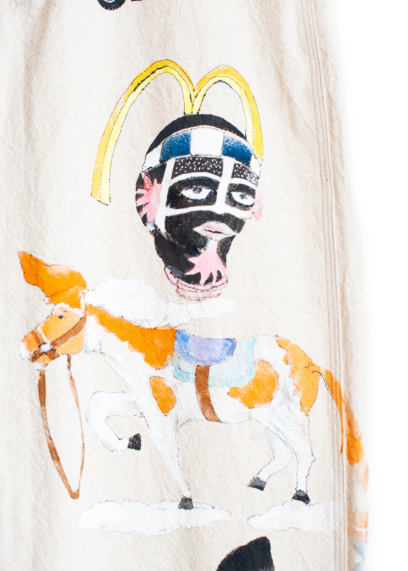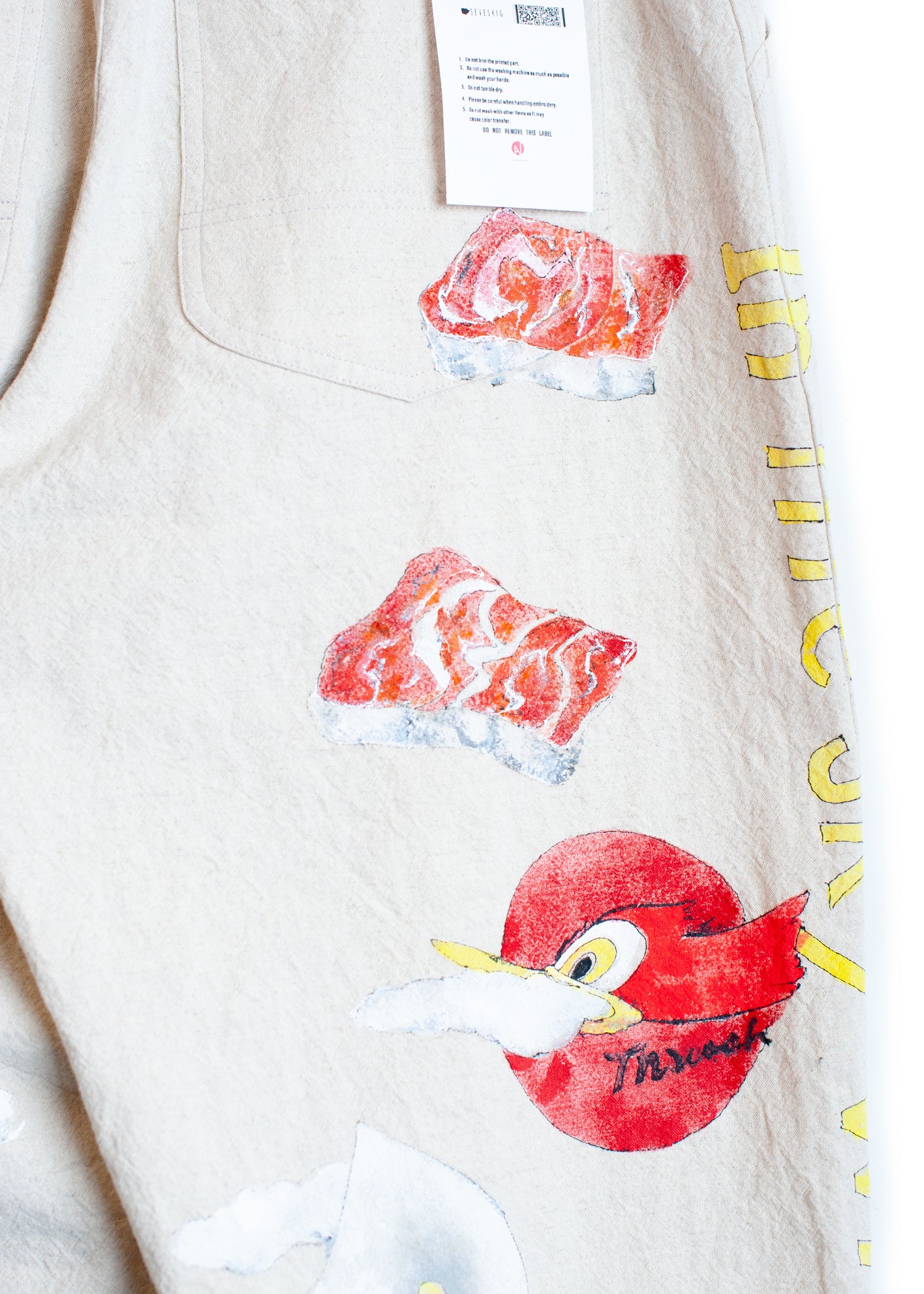 それらのイメージを元にし、イラストを『RIDAWO』氏の自由に描いた絵を手書きしたワイドパンツ。