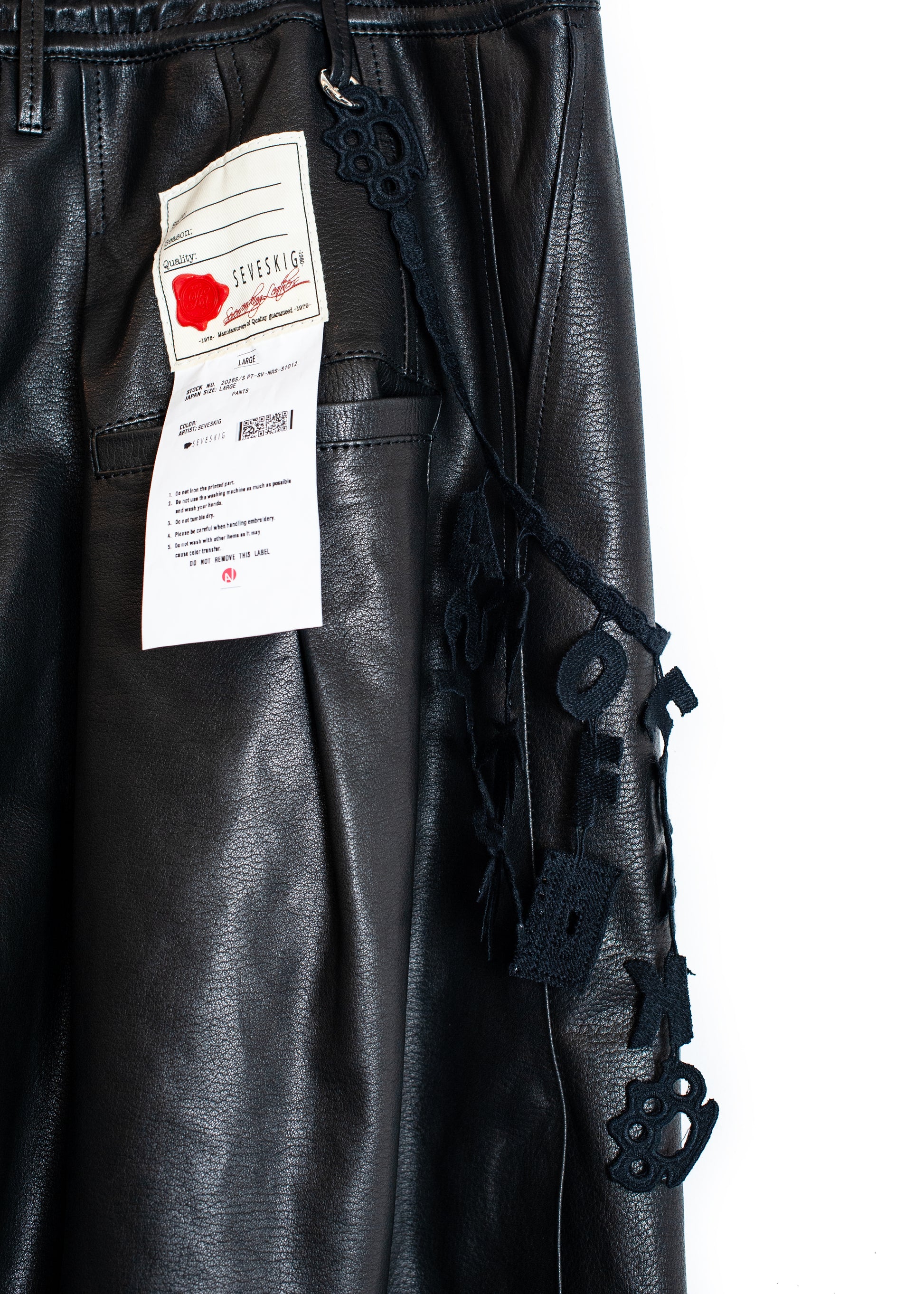 さらにサイドにはスナップボタンを配置。開閉によってシルエットや抜け感を調整でき、動きやすさにも配慮しています。レザーの無骨さに、機能性と遊びを重ねた一本です。