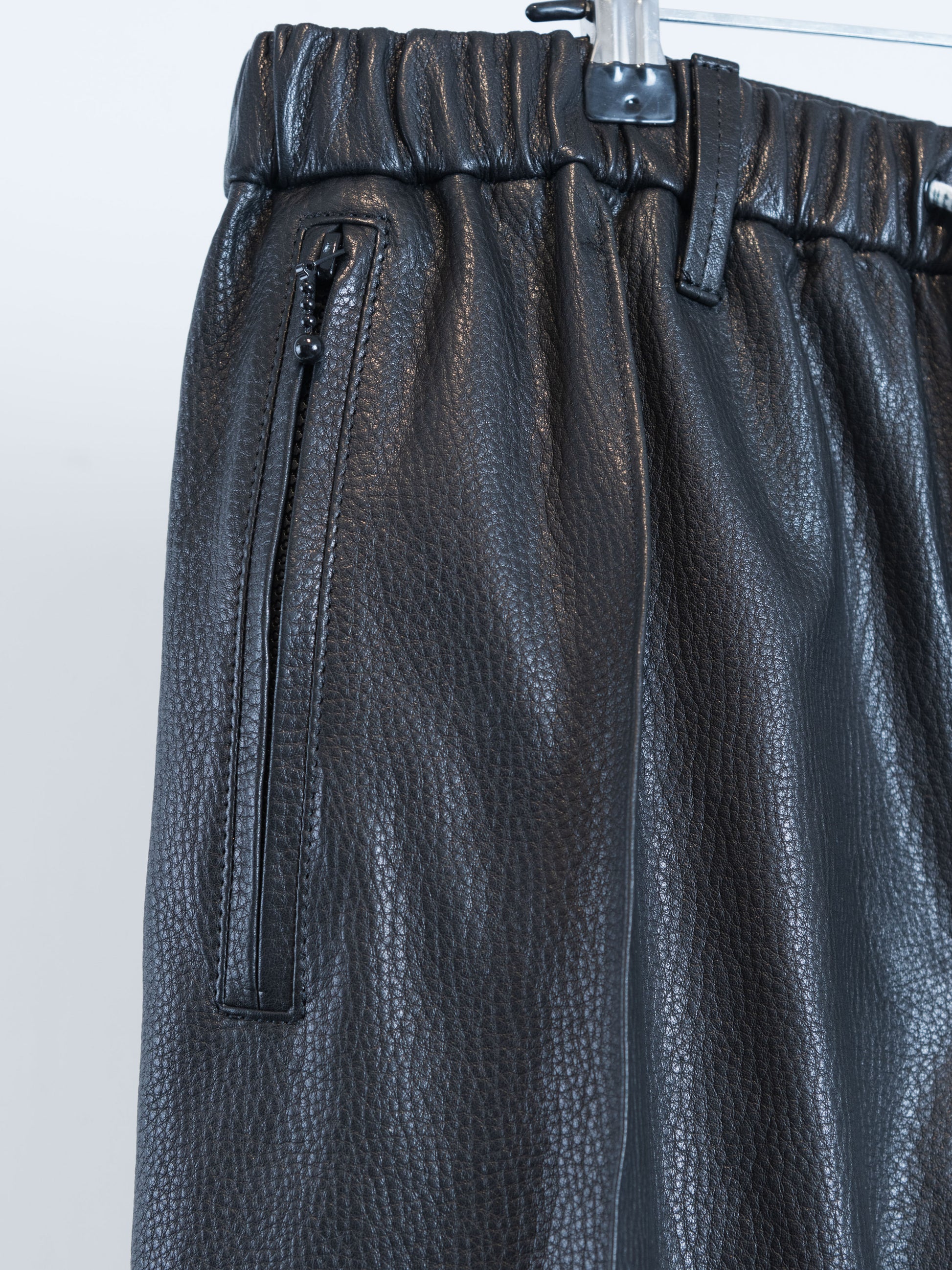 日本国内で食肉用として育てられたホルスタインを原材料とした、質感豊かなワイドトラックパンツ。