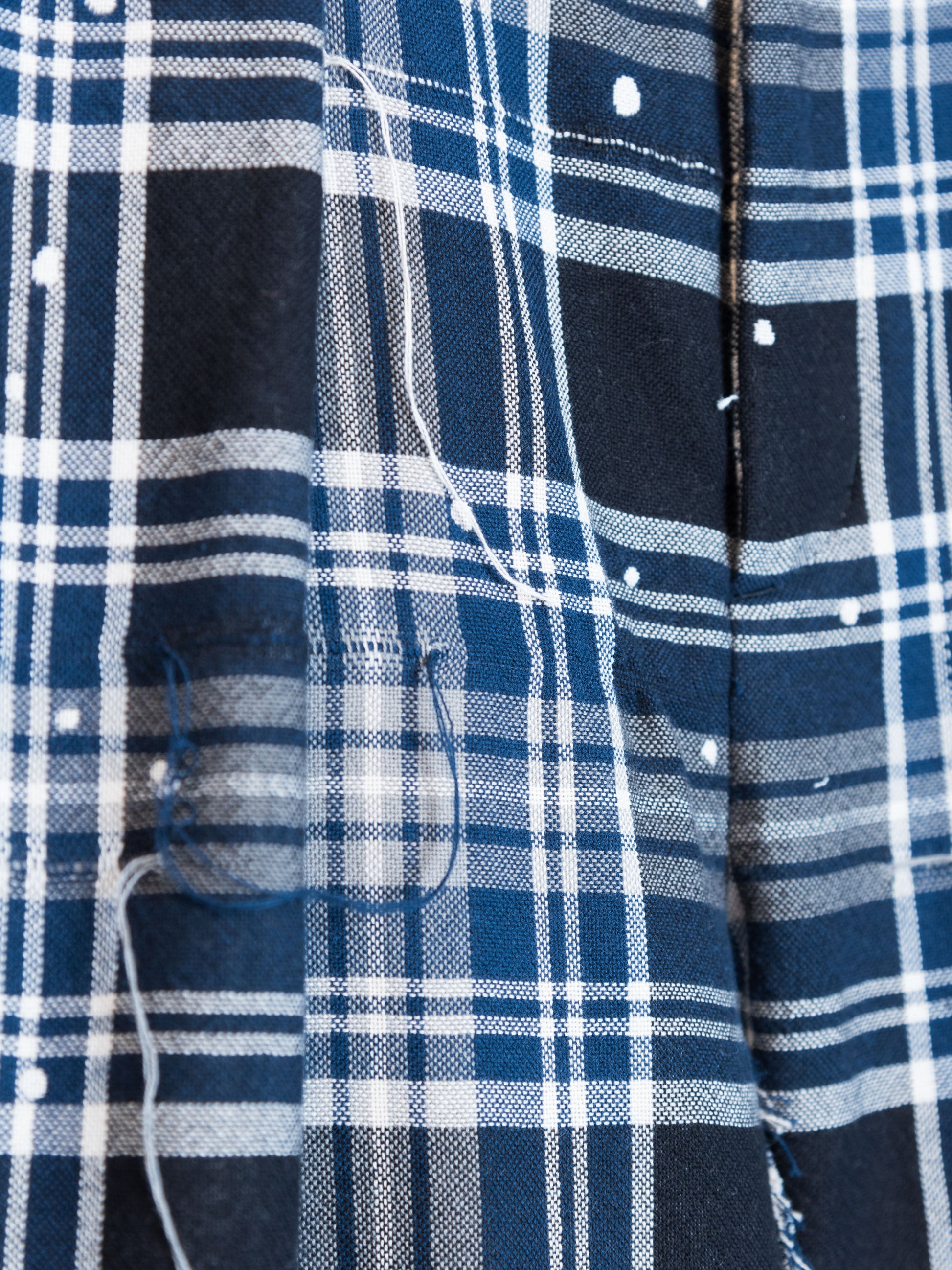 ドビーでの表現に加えてジャカード織を用いることで、チェック柄に新たな次元を加えています。