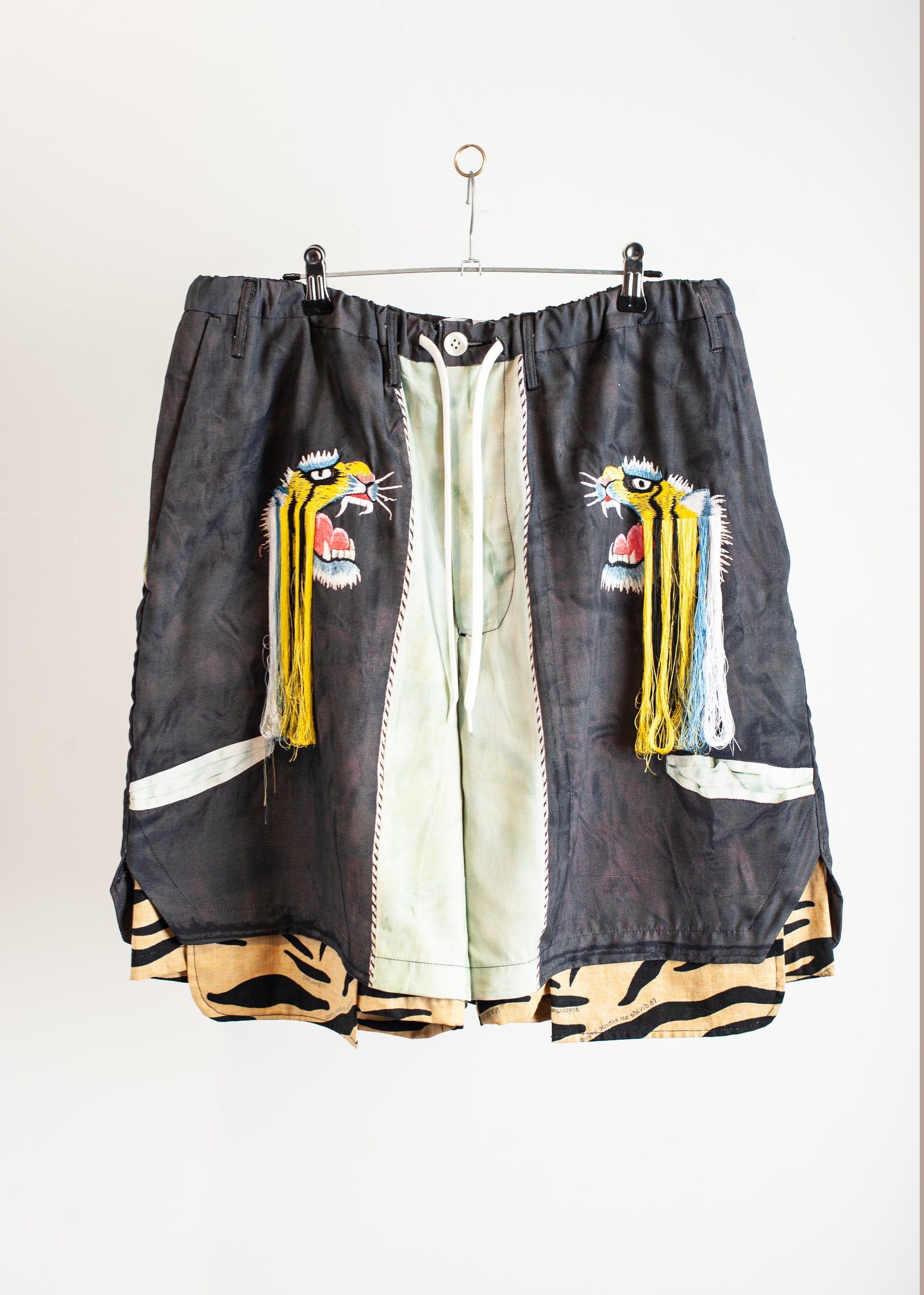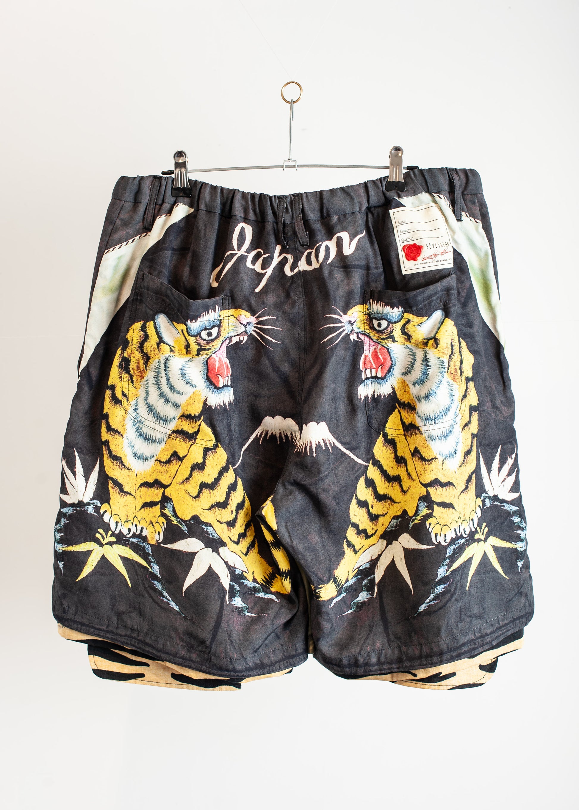 あたかもビンテージスカジャンを腰に巻いているかのようなフェイクスカジャンショートパンツに仕上げました。