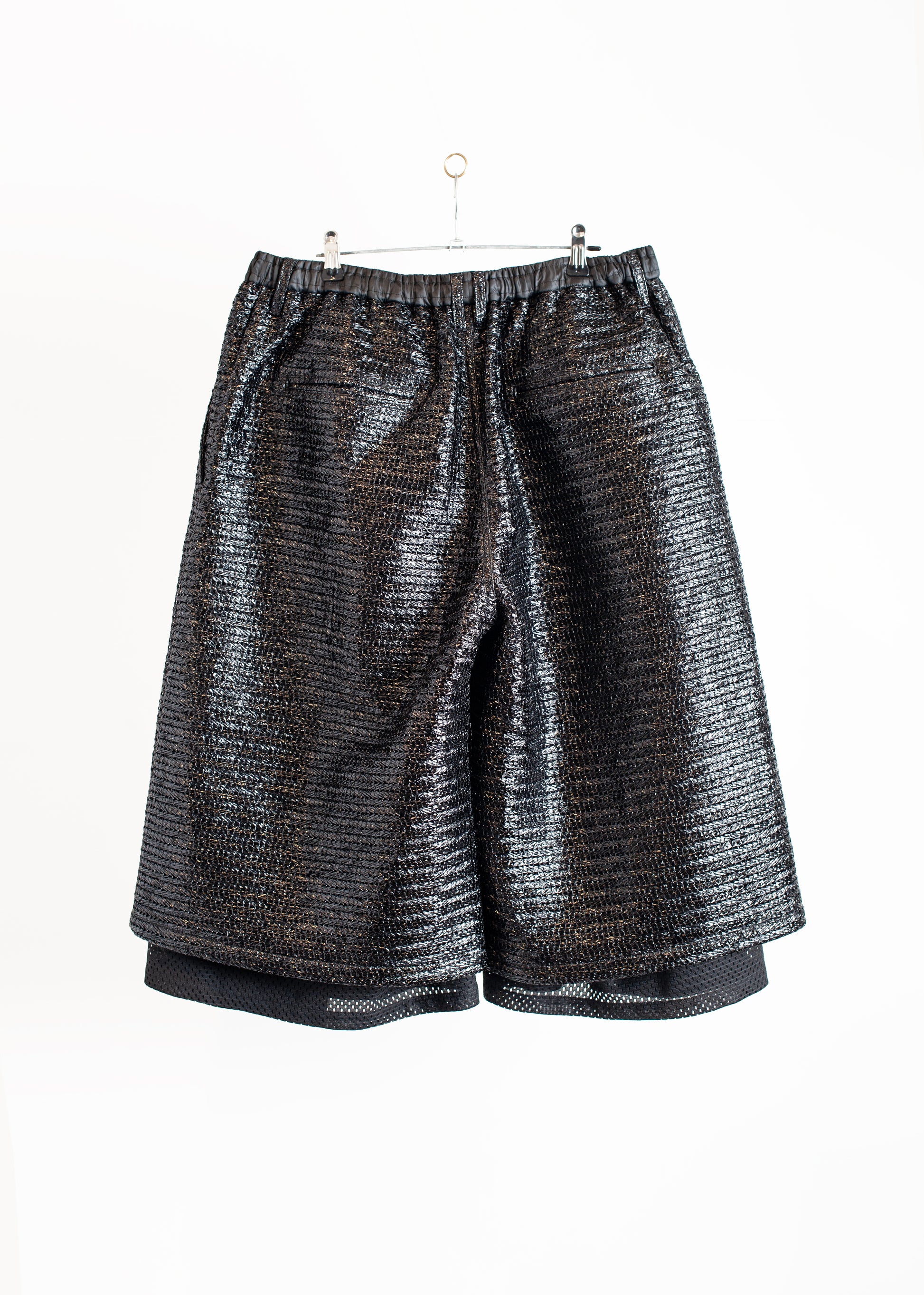 透明なナイロン扁平糸を経編機にかけた特殊なストレッチ素材を使用したビッグワイドショートパンツ。