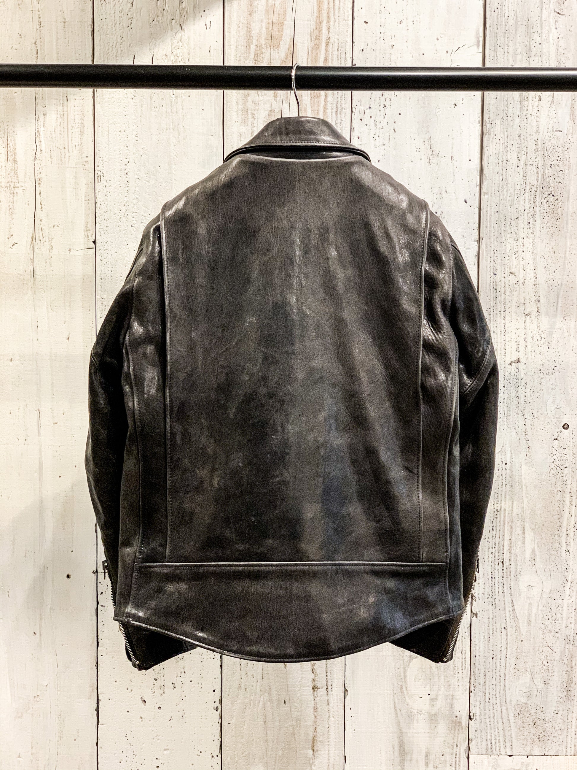 厚みのある革で着込んだ時の袖ジワや背中ジワは最高の経年変化になります。